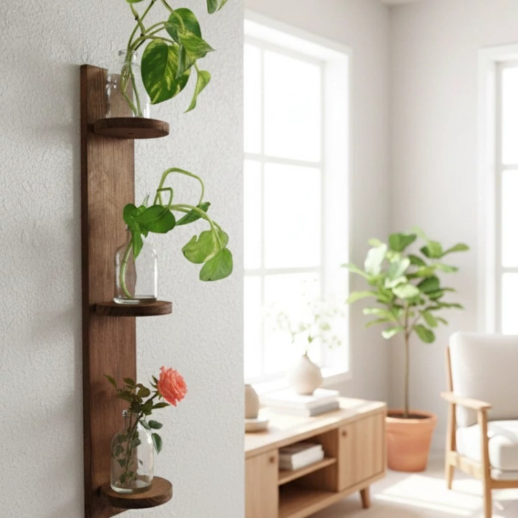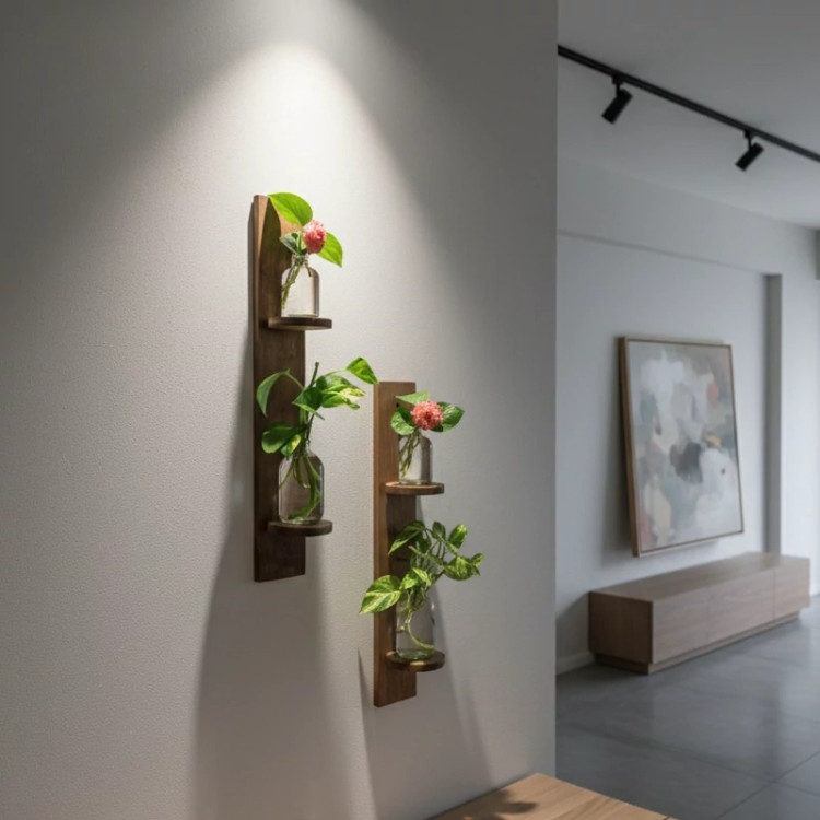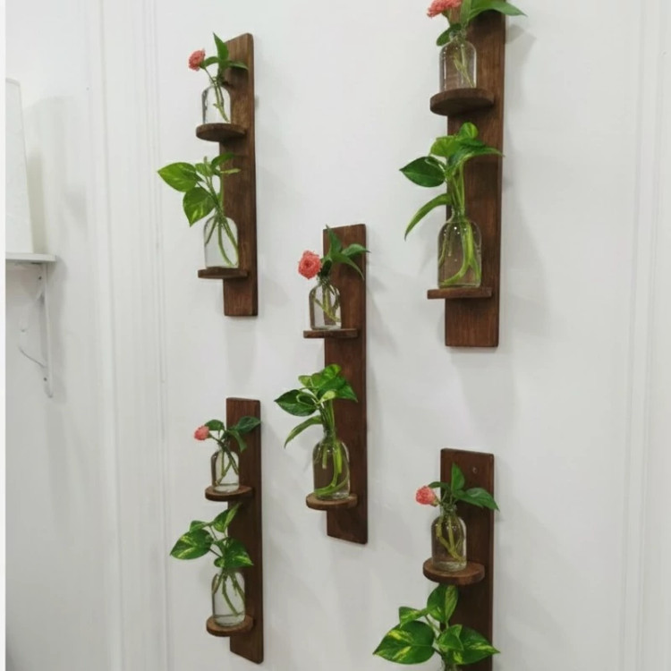 شلف دیواری دکوری گلدان چوبی پشت چسب دار به همراه گلدان (پک دوتایی) استند دیواری